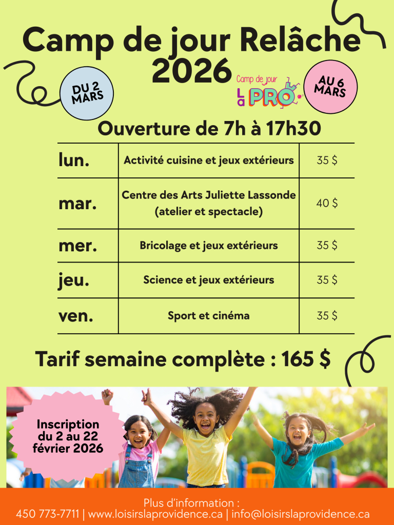 Du 2 au 6 mars, le camp de jour La Pro vous propose une semaine remplie d’activités variées, principalement au centre communautaire afin de réduire les coûts au maximum. Le service est offert de 7 h à 17 h 30, et les frais de service de garde sont inclus dans le tarif.